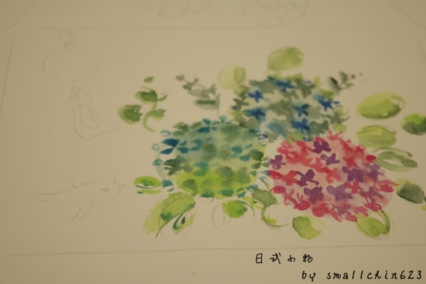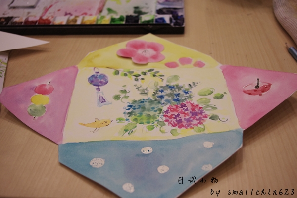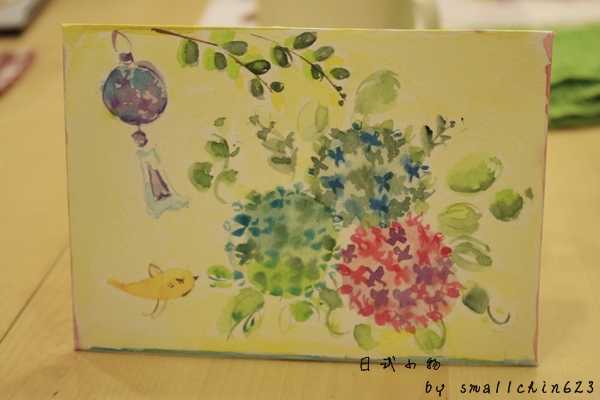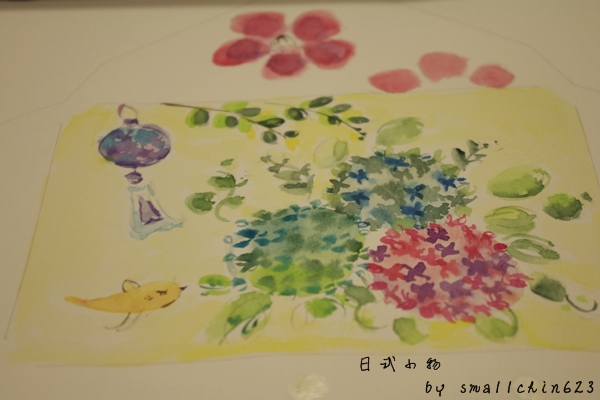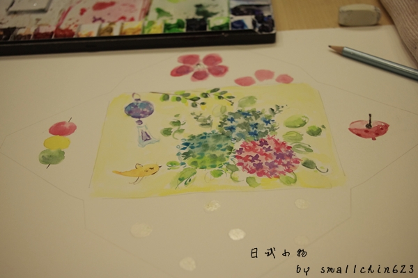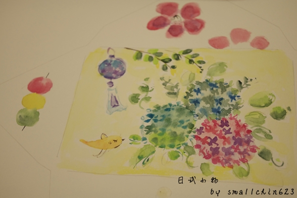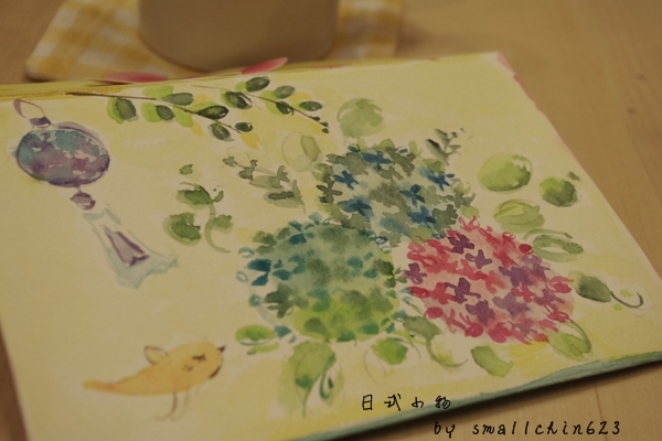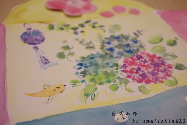 自由發揮畫上自已喜愛的日式小物,我選擇了很有豐富感的繡球花、風鈴~